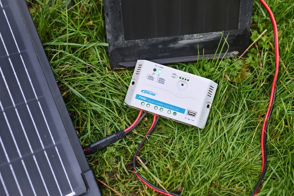 Waterdicht (IP65), licht en eenvoudig te plaatsen met standaard en 5 m kabel. Inclusief USB-uitgang voor kleine apparaten.
